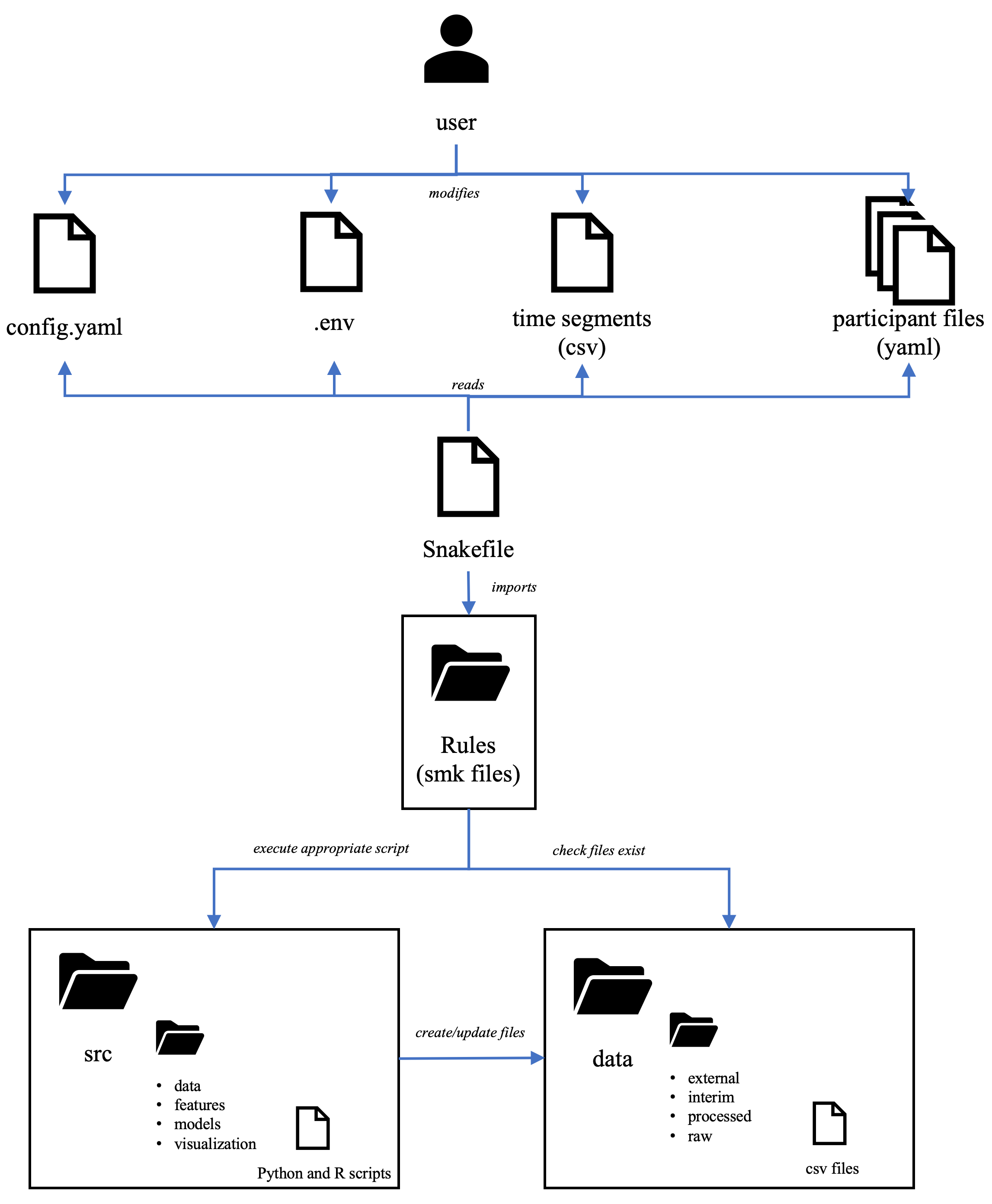 In the figure below, we represent the interactions between users and files. After a user modifies the configuration files mentioned above, the Snakefile file will search for and execute the Snakemake rules that contain the Python or R scripts necessary to generate or update the required output files (behavioral features, plots, etc.).