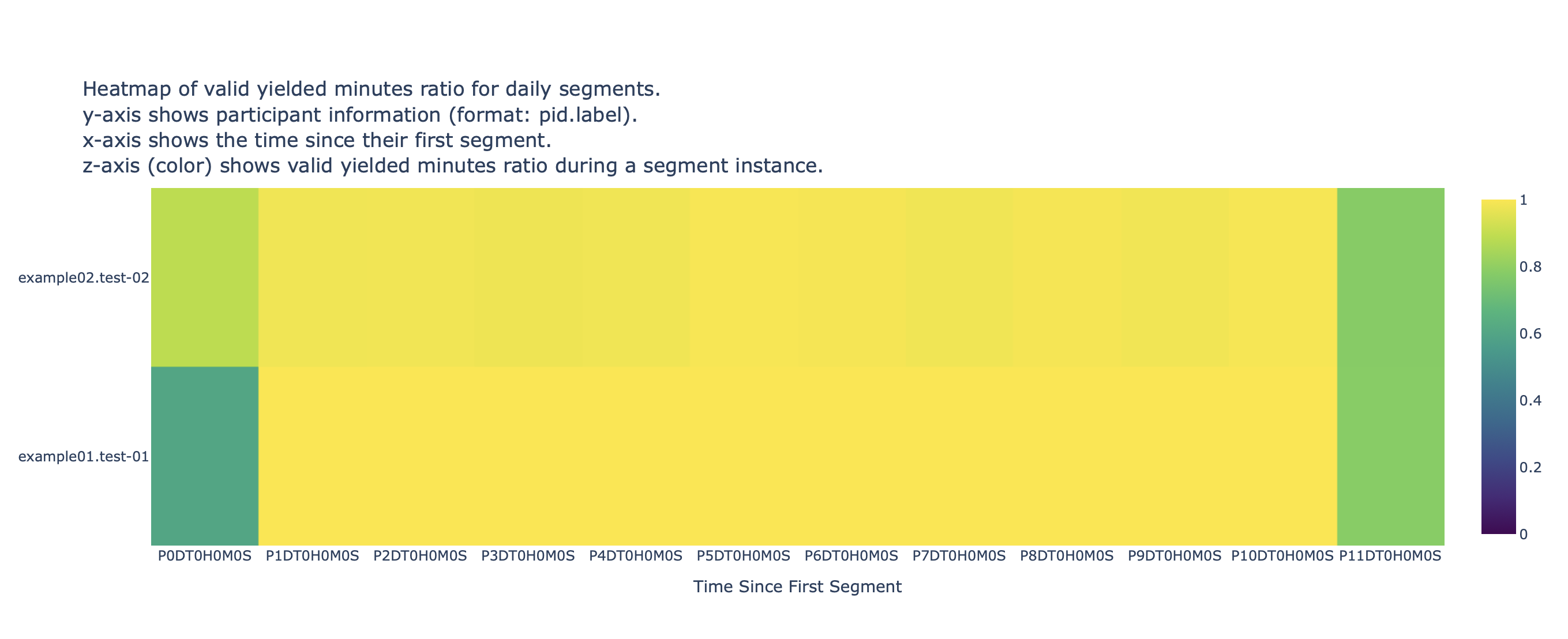 The figure below shows the heatmap of the valid yielded minute ratio for participants example01 and example02 on daily segments and, as we inferred from the previous histogram, the lighter (yellow) color on most time segment instances (cells) indicate both phones sensed data without interruptions for most days (except for the first and last ones).