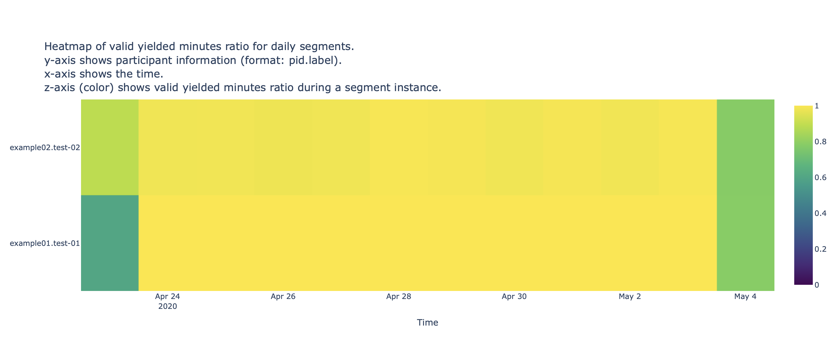 The figure below shows the heatmap of the valid yielded minute ratio for participants example01 and example02 on daily segments and, as we inferred from the previous histogram, the lighter (yellow) color on most time segment instances (cells) indicate both phones sensed data without interruptions for most days (except for the first and last ones).