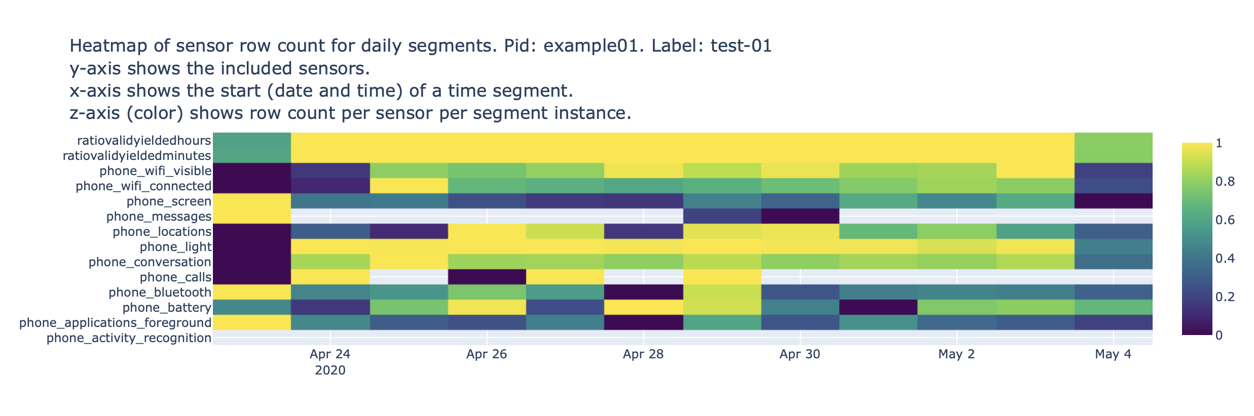 The figure below shows this heatmap for phone sensors collected by participant example01 in daily time segments from Apr 23rd 2020 to May 4th 2020. We can infer that for most of the monitoring time, the participant’s phone logged data from at least 7 sensors each minute.