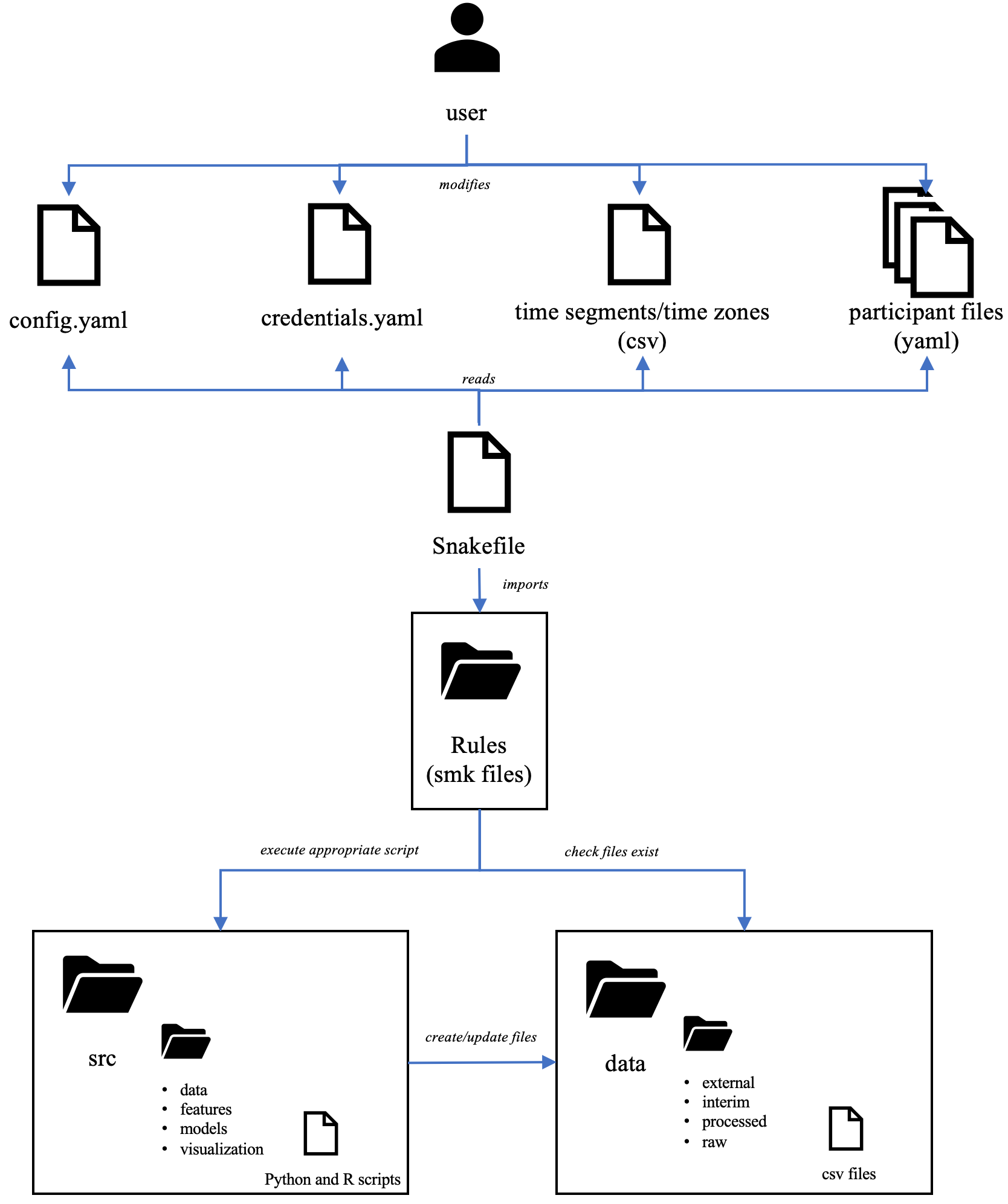 You will most of the time only have to modify configuration files in YAML format (config.yaml, credentials.yaml, and participant files pxx.yaml), and in CSV format (time zones and time segments).