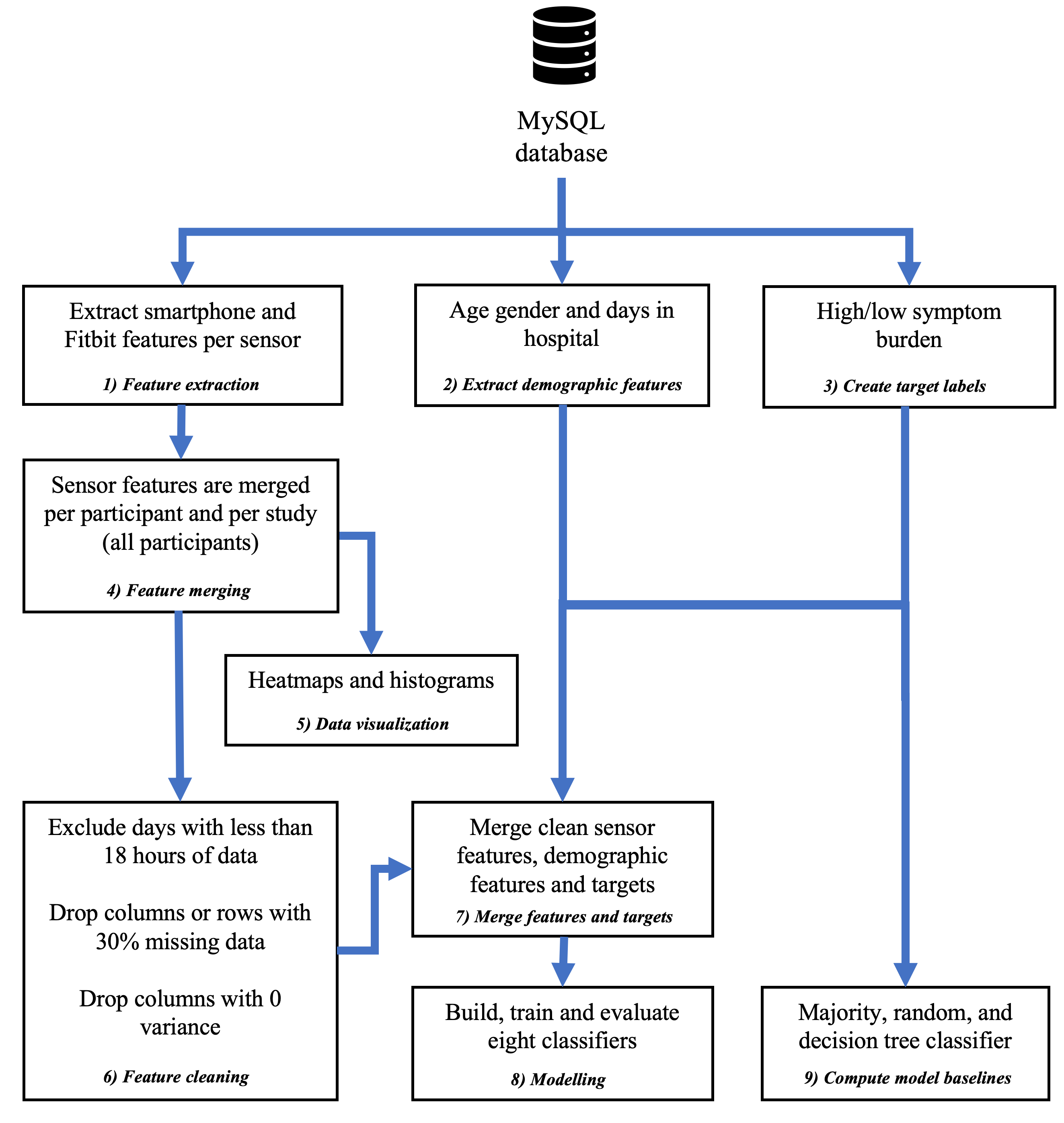 The goal of this workflow is to find out if we can predict the daily symptom burden score of a participant. Thus, we framed this question as a binary classification problem with two classes, high and low symptom burden based on the scores above and below average of each participant. We also want to compare the performance of individual (personalized) models vs a population model.