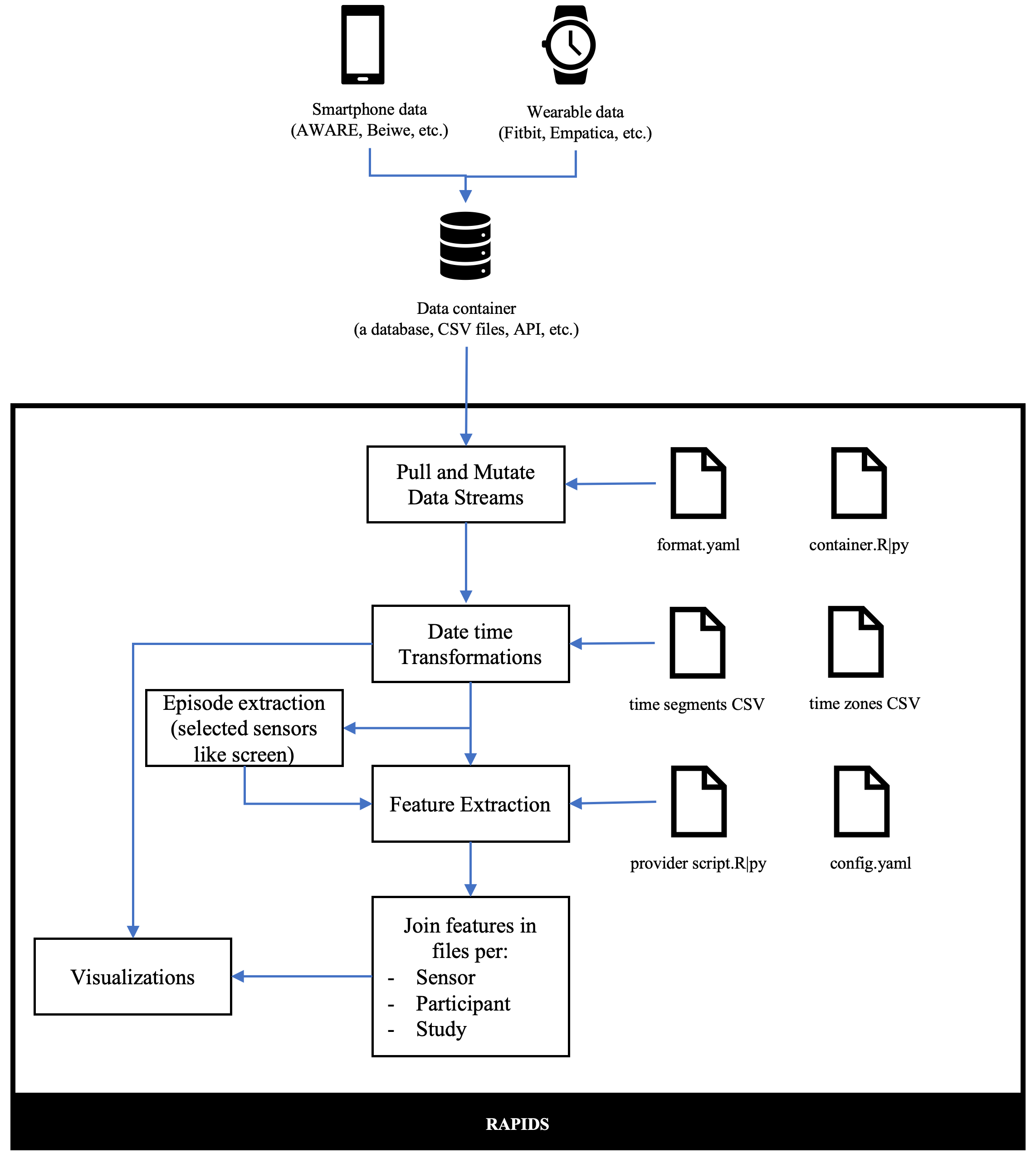 In the figure below, we represent the flow of data in RAPIDS. In broad terms, smartphone and wearable devices log data streams with a certain format to a data container (database, file, etc.).